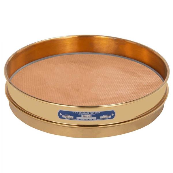 12in (305mm) diameter ASTM E11 Test Sieve has brass woven-wire cloth with No.40 (425µm) openings and half-height brass frame. The overall height is 2-5/8in and the stacked height is 1-3/4in.