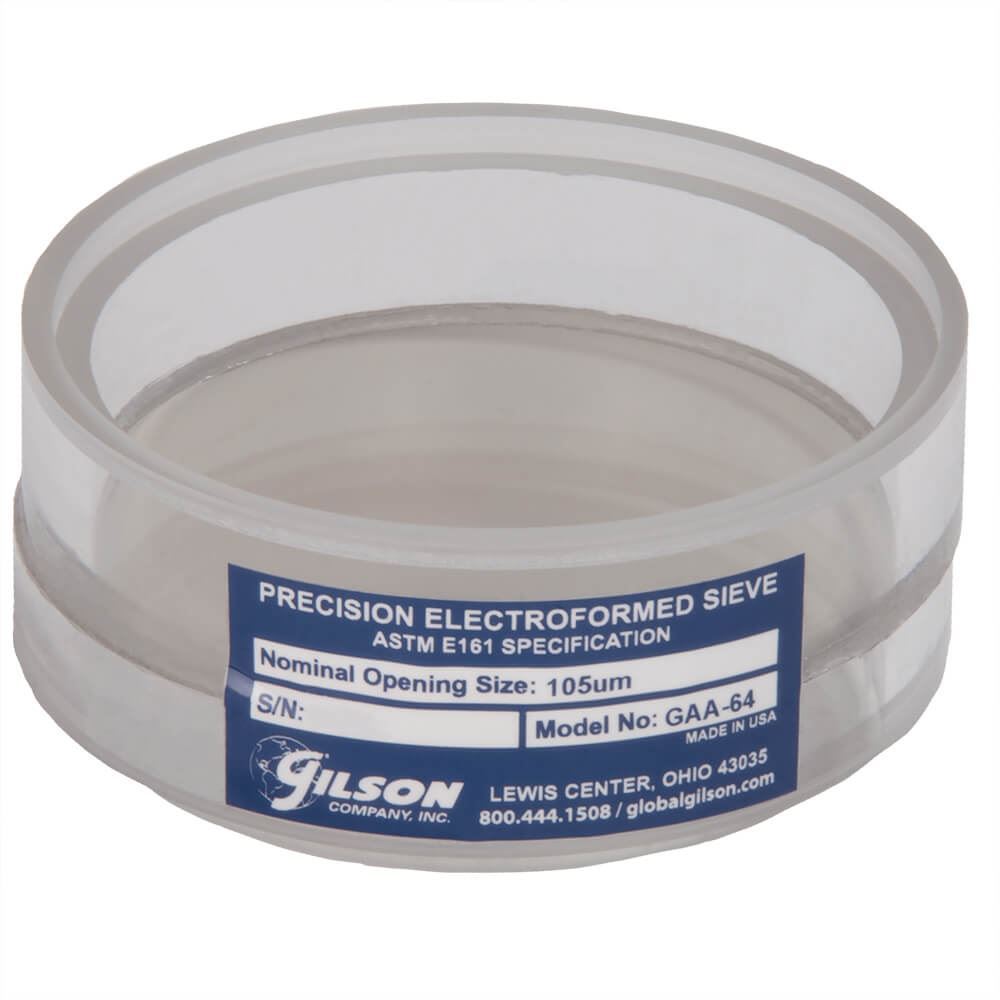 3in (76mm) diameter Precision Electroformed Acrylic Frame Test Sieve has ASTM E161 electroformed material with 100µm openings and an acrylic frame. The overall height is 1.46in (37.1mm) and the stacked height is 1.38in (35.1mm).