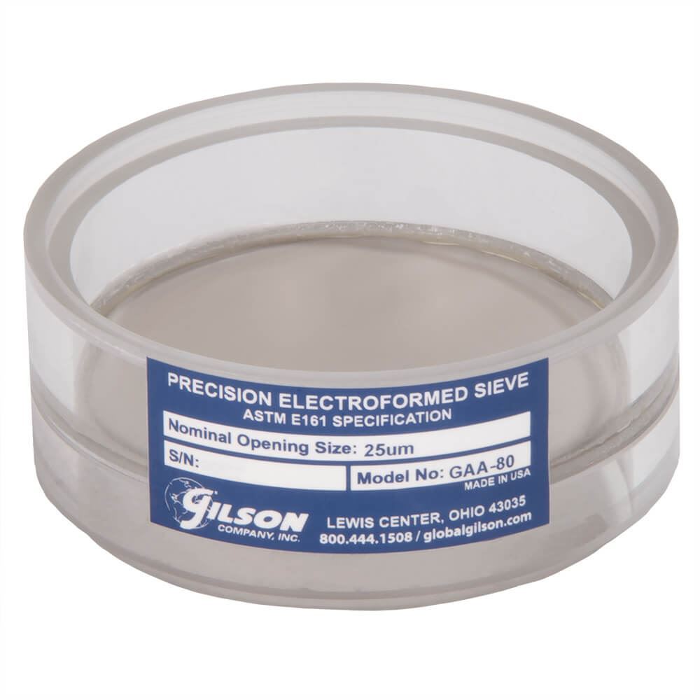 3in (76mm) diameter Precision Electroformed Acrylic Frame Test Sieve has ASTM E161 electroformed material with 5µm openings and an acrylic frame. The overall height is 1.46in (37.1mm) and the stacked height is 1.38in (35.1mm).
