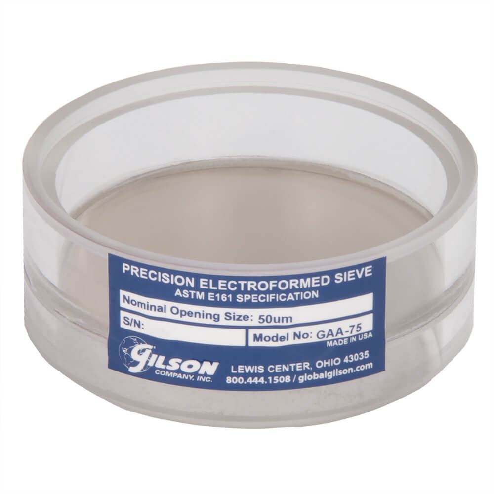 3in (76mm) diameter Precision Electroformed Acrylic Frame Test Sieve has ASTM E161 electroformed material with 50µm openings and an acrylic frame. The overall height is 1.46in (37.1mm) and the stacked height is 1.38in (35.1mm).