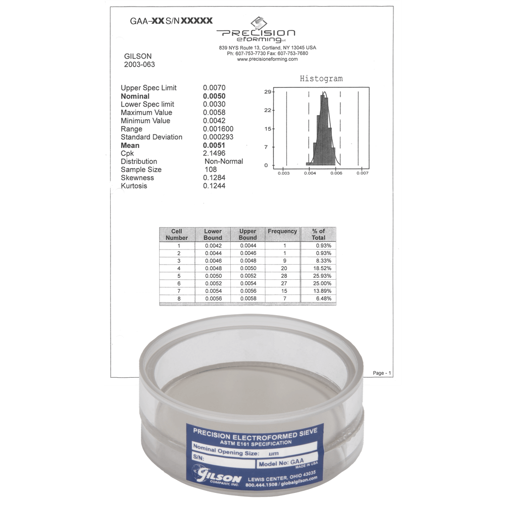 3in (76mm) diameter Precision Electroformed Acrylic Frame Test Sieve has ASTM E161 electroformed material with 80µm openings and an acrylic frame. The overall height is 1.46in (37.1mm) and the stacked height is 1.38in (35.1mm).