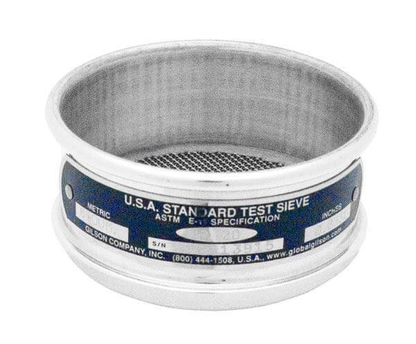 3in (76mm) diameter ASTM E11 Test Sieve has stainless steel woven-wire cloth with 80µm openings and a half-height stainless steel frame. The overall height is 1-1/4in and stacked height is 5/8in.