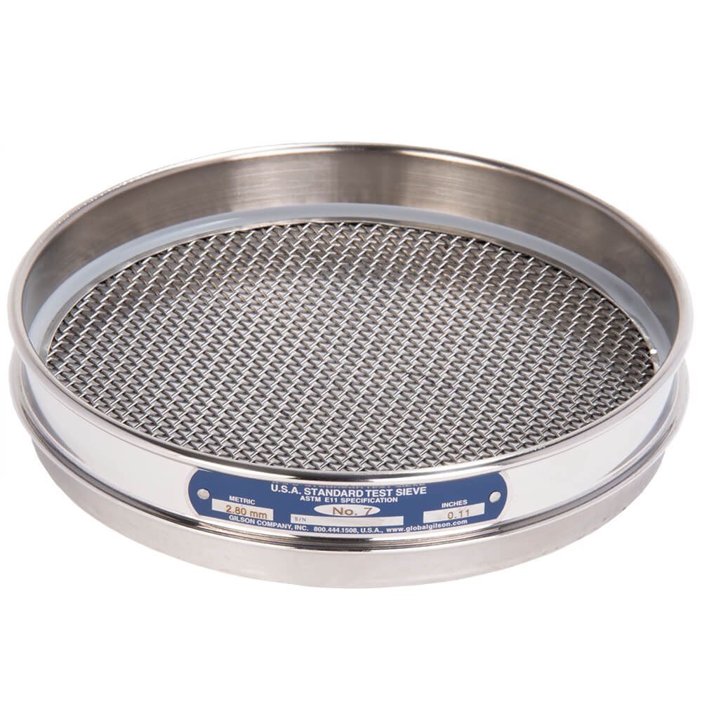 8in (203mm) diameter ASTM E11 Test Sieve has stainless steel woven-wire cloth with No.7 (2.8mm) openings and half-height stainless steel frame. The overall height is 1-5/8in and the stacked height is 1-1/8in.