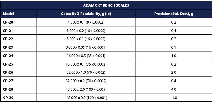 Click to enlarge or download the Adam Cruiser Bench Scales Comparison Table below to compare capacity, readability, and precision specifications.