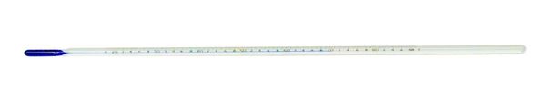 ASTM S120C Equivalent Non-Mercury Thermometer is an Equivalent application type thermometer with a temperature range of -7°–105°C and a division of 0.5°C. The thermometer length is 12in. This thermometer is white-backed glass with permanently etched graduations and individually packaged in a protective cardboard tube. This ASTM equivalent non-mercury filled thermometer has the same performance characteristics as ASTM Thermometers, but has not yet been reviewed and accepted by ASTM for these test applications. This thermometer uses the same safe blue liquid in the ASTM Non-Mercury Thermometers. The blue-spirited liquid is a biodegradable, non-toxic, and non-hazardous proprietary formula. It is supplied with a statement of compliance and meets ASTM E1 and E77.