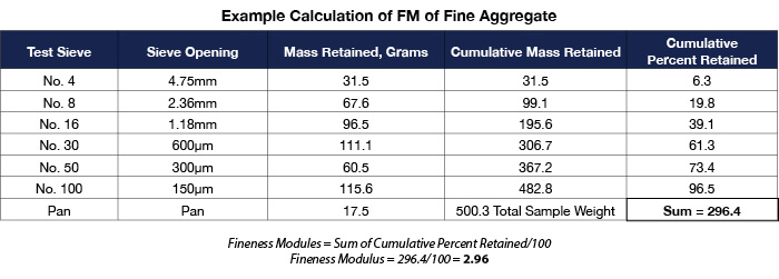To sum up, fineness modulus (FM) is not only required for complete, workable concrete mix designs, but it is also a tool to use in evaluating aggregate gradations, adjusting proportions, and controlling the properties that characterize completed mixes.