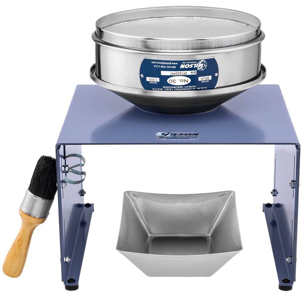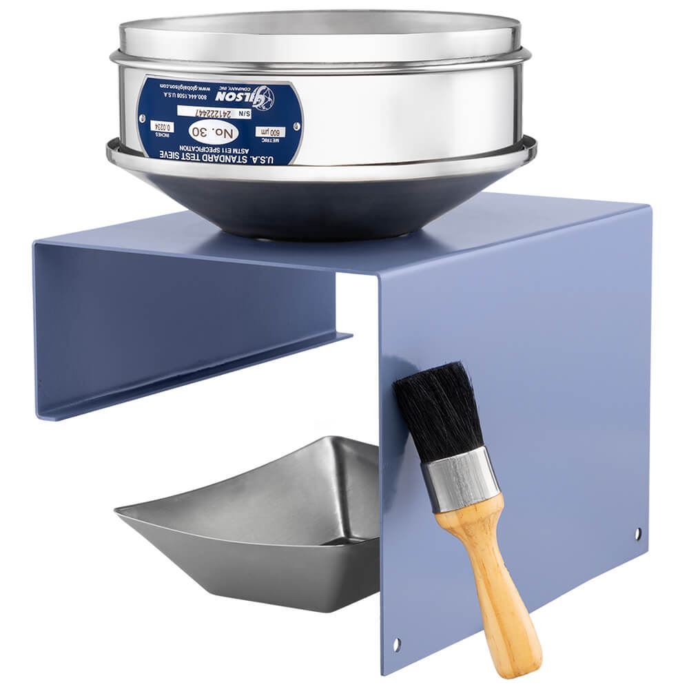 Clean-N-Stor Accessory units offer a fast and efficient method of emptying, cleaning, and weighing 8in or 200mm sieves during particle sizing operations. Each unit consists of a metal stand with stainless steel funnel, a soft-bristle brush for cleaning, and a TSA-181 Weighing Pan, which is placed beneath the stand and funnel to collect samples. Stand-alone models can be positioned directly over an electronic balance for weighing operations.