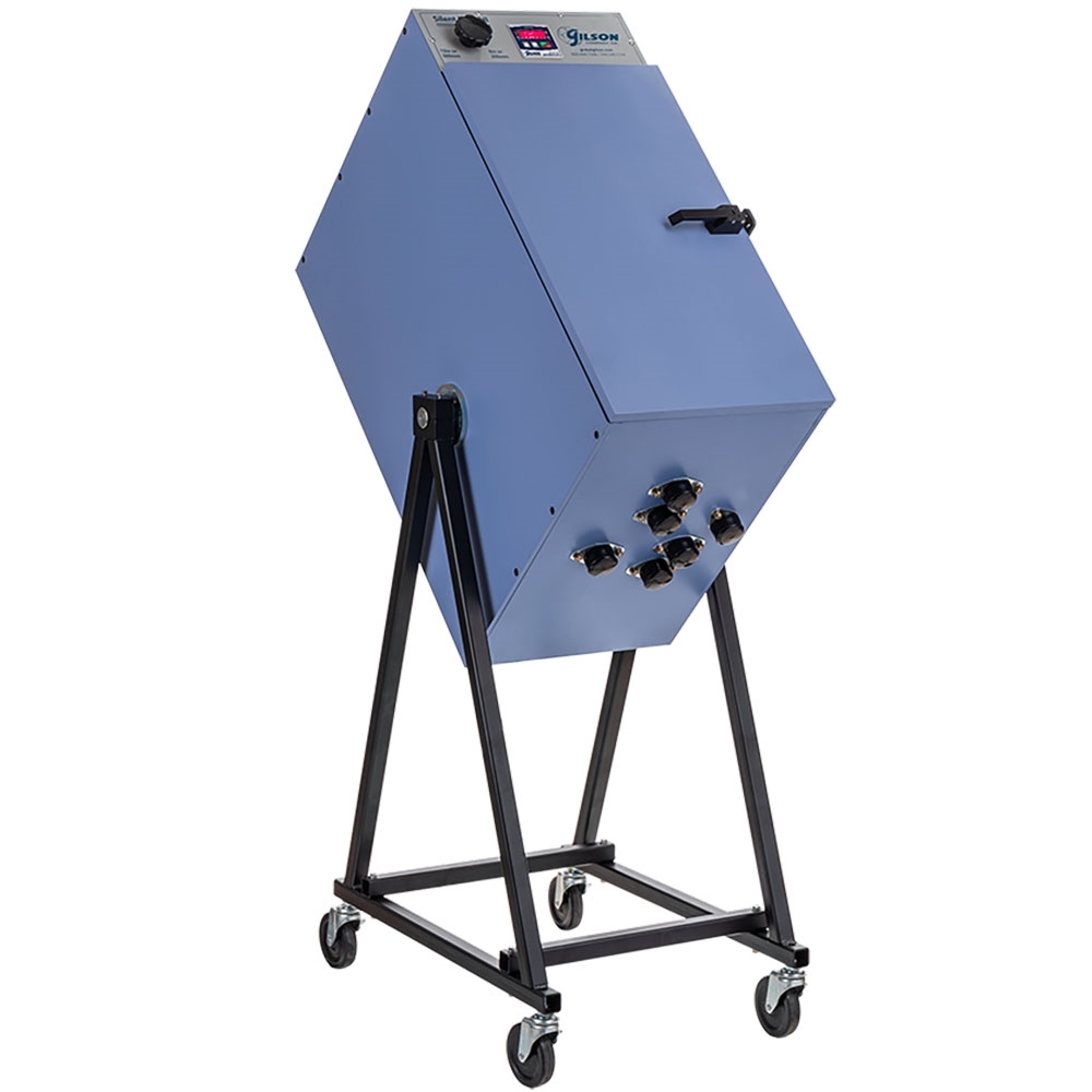 The tightly sealed cabinet uses sound-deadening materials and a proprietary design to limit noise during operation. The cabinet is a high-quality CNC machined MDF board, precisely fitted to confine and control airborne respirable quartz, silica, crystalline particles, and other nuisance dust to further protect personnel and permit easy cleanup. The full-width cabinet door swings open fully on heavy-duty commercial-grade hinges to permit easy loading and unloading of test sieves. The cabinet sits atop a sturdy powder-coated stand constructed of heavy ASTM A513 steel tubing and rolls on 4in hard rubber locking swivel casters for easy mobility in the lab.