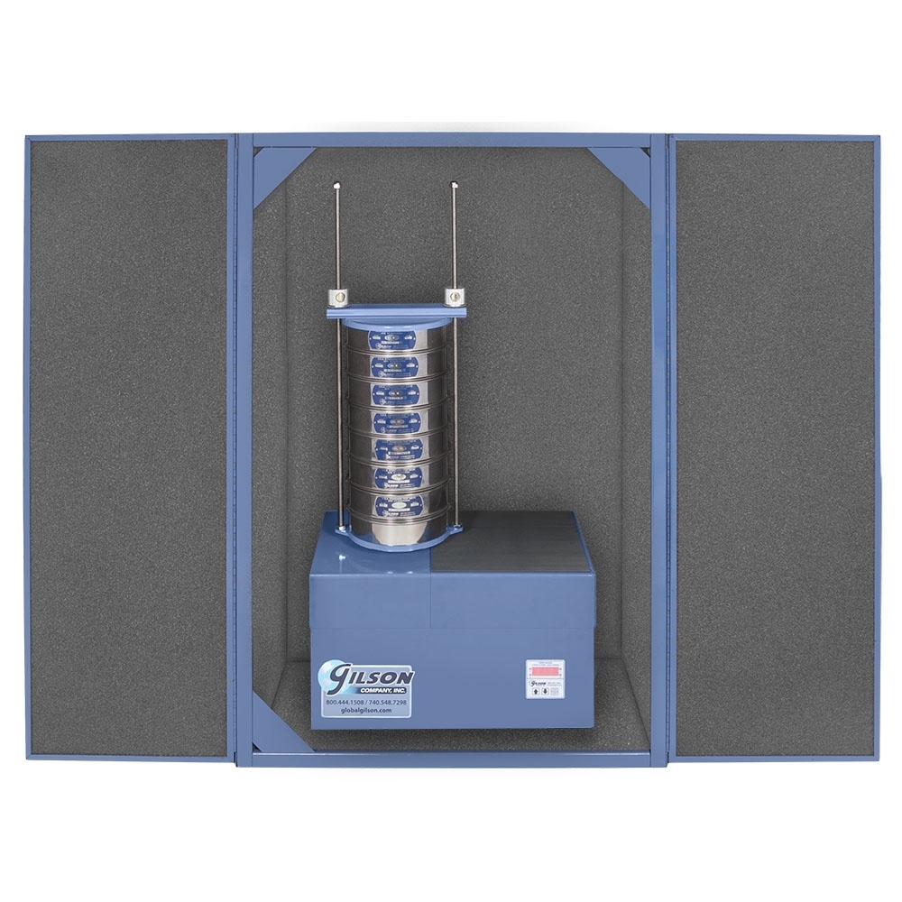 SSA-805R Gilson Sound Enclosure is designed for use with SS-8R and SS-12R Gilson Tapping Sieve Shakers to control noise and dust associated with sieving operations. It can also be used with other lab equipment for noise and dust reduction. The sturdy painted steel case has full-width hinged doors and is lined with 1in (25.4mm) thick sound-attenuating foam.