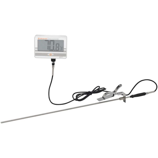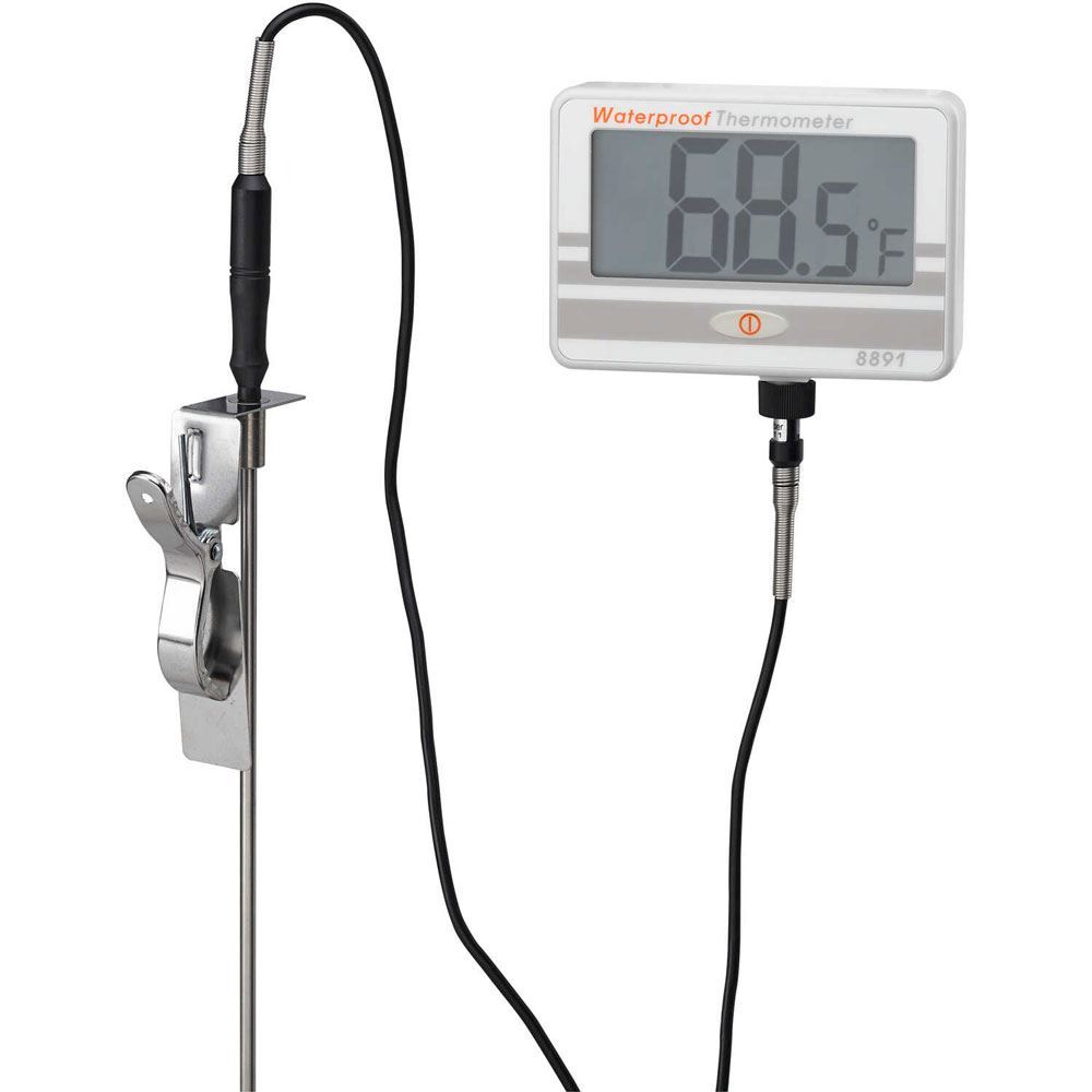 The extra-long 19in (483mm) high-accuracy thermistor probe on a 59in (1.5m) cable quickly attaches to tank walls with the included clamping bracket. Wall-mounting hardware is also included for the display unit. The assembled thermometer is rated IP67 waterproof. Four AAA batteries are included and power the thermometer for about one year of continuous use.