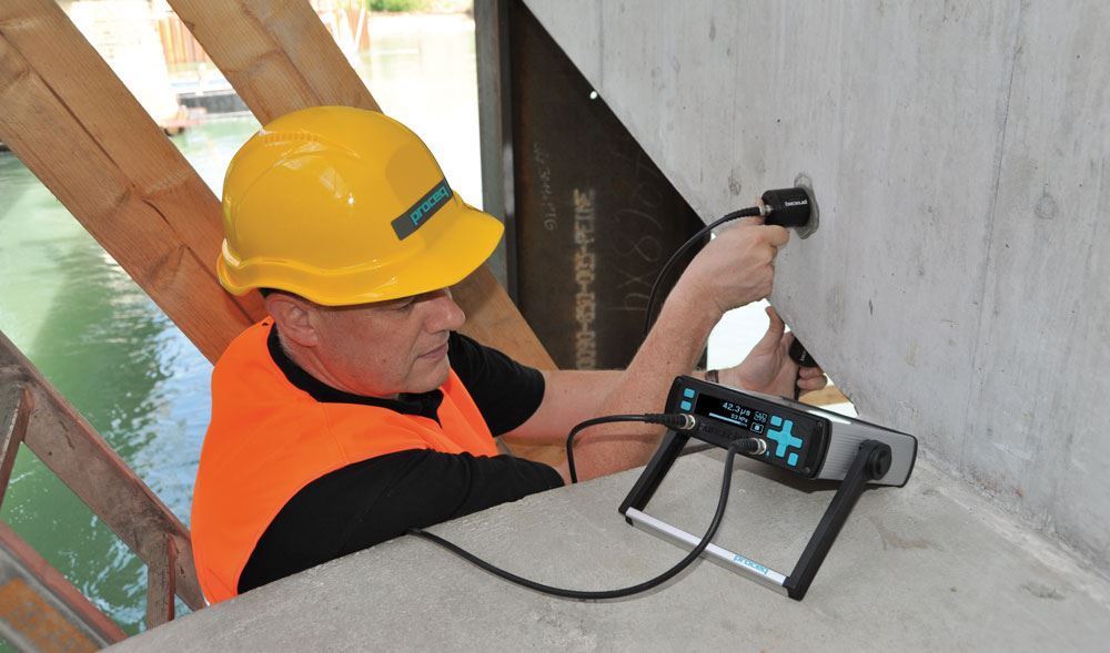 Proceq Pundit Ultrasonic Pulse Velocity (UPV) Instruments provide an accurate and reliable means of assessing the quality of concrete. Transmission and receiving transducers send and receive a timed pulse of ultrasonic energy through the concrete to be tested. The time the signal takes to get through the concrete is used to determine its homogeneity and integrity. Pulse velocity measurements measure concrete uniformity, detect cracks and voids, track changes over time, and determine dynamic physical properties. Compressive strength can be estimated using the SONREB (SONic-REBound) method, the combined ultrasonic pulse velocity/rebound value from a Schmidt concrete test hammer. Measurement modes include crack depth, pulse velocity, surface velocity, data logging, and E-modulus. A range of additional transducers is available to allow more depth of penetration or better resolution.