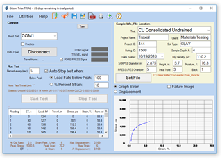 Triaxial Compression Data Acquisition Software automatically records axial load and deformation data of UU, CU, CD, or unconfined soil samples. The user can also manually enter pore pressure values or allow the software to automatically recognize the pore pressure signal when a pore pressure transducer is connected to a data readout box. This intuitive software utilizes clear data entry fields and testing prompts to reduce user error and increase repeatability.
