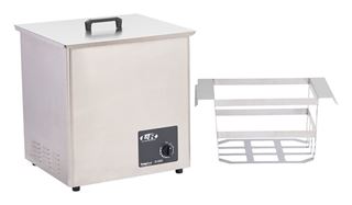 Ultrasonic Multi-Sieve Cleaner has a volume of 11.62gal (44L) and is used for full immersion cleaning of four full-height or six half-height 8in (203mm) sieves or partial-immersion cleaning of two full- or intermediate-height or three half-height 12in (305mm) sieves using manual repositioning. The generator features microprocessor circuitry, a 0–60min timer, and a cooling fan. The stainless steel tank is equipped with a drain valve.