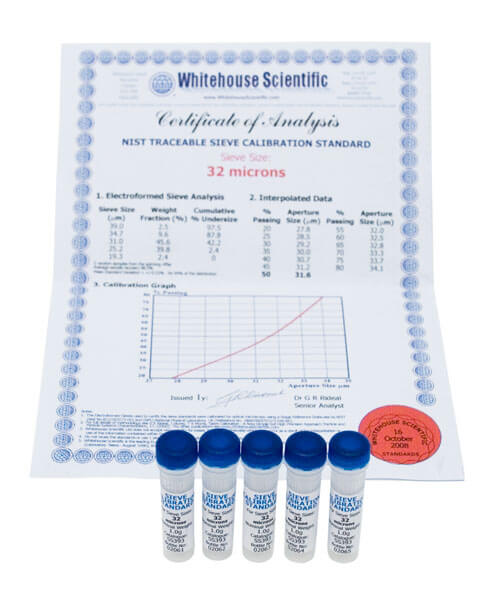 White House Sieve Standards for sieves with No.450 (32µm) opening sizes are supplied with five vials, each with a nominal weight of 1.0g.